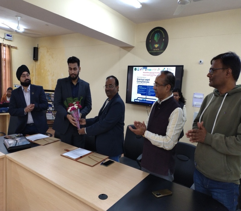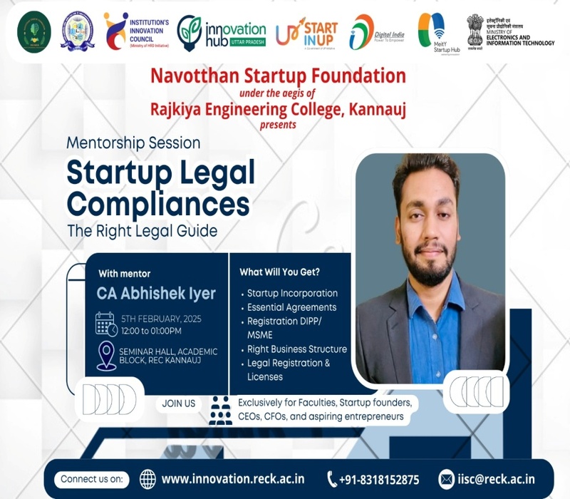 On 05/02/2025, an insightful mentorship session was organized at Navotthan Startup Foundation, REC Kannauj focusing on the topic “Startup Legal Compliances: The Right Legal Guide”. The mentorship session conducted for aspiring entrepreneurs and startup founders as well as college students with essential insights into the legal framework required for running a compliant and successful business. The speakers emphasized the significance of adhering to legal norms to avoid penalties, lawsuits, and operational disruptions. Mr. Kawalpreet Arora stressed the necessity of well-drafted agreements, including co-founder agreements. He also shares his inghits on checklist of mandatory annual filings with regulatory bodies such as the MCA, ROC, and SEBI. CA Mr. Abhishek Iyer Discussion on different legal entities such as Sole Proprietorship, LLP, Private Limited Company, and their respective compliances. The MoU Exchange Ceremony was also celebrated at the end of the session. The MoU signed between Lefinex Services Pvt. Ltd. and Navotthan startup Foundation.
