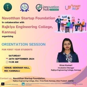 328th September 2024Orientation session on Incubation opportunities for B.Tech First Year studentsSeminar Hall, Academic Block, REC Kannauj