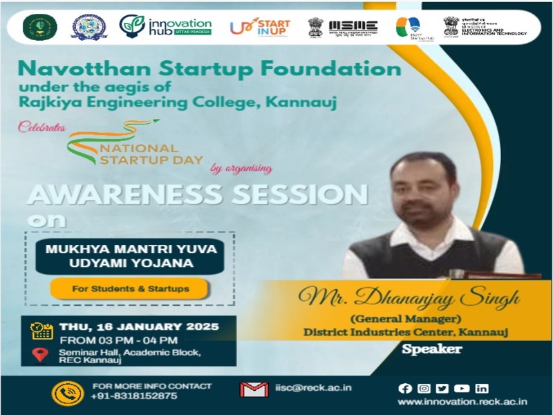 On the occasion of National Startup Day, an awareness event on the Mukhya Mantri Yuva Udyami Yojana was organized to educate and inspire aspiring entrepreneurs. The program aimed to highlight the benefits and opportunities provided under this government scheme, which is designed to foster entrepreneurship and economic growth among the youth. The event was graced by Mr. Dhananjay Singh, General Manager of the District Industries Centre, Kannauj. In his keynote address, he shared invaluable insights into the objectives of the Mukhya Mantri Yuva Udyami Yojana, Government’s vision for promoting a culture of innovation and entrepreneurship and emphasized its role in empowering young entrepreneurs through financial assistance, skill development, and infrastructure support.. Mr. Dhananjay Singh, seeking clarifications on the application process, required documentation and all necessary steps for filing up the application form for this scheme.