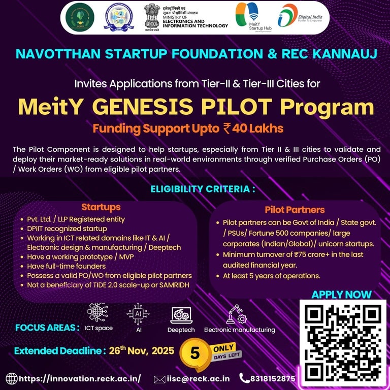 Navotthan Startup Foundation, Incubation Center of Rajkiya Engineering College Kannauj is inviting applications for the MeitY GENESIS PILOT Program from eligible startups particularly from Tier-II and Tier-III cities with funding support of upto โน40 Lakhs per startup to validate and demonstrate their market-ready solutions through pilot projects with corporates, PSUs, and large enterprises.