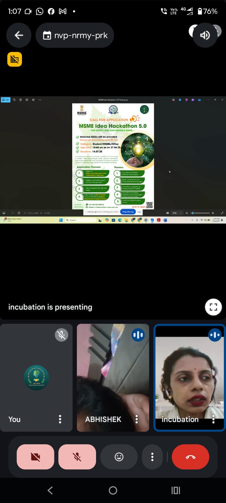 An orientation session was successfully conducted on 04th July 2025 to guide aspiring innovators, students, and early-stage entrepreneurs on the topic “How to Apply for MSME Idea Hackathon 5.0.” The event aimed to create awareness and provide a detailed walkthrough of the application process, eligibility criteria, and benefits of the scheme initiated by the Ministry of Micro, Small & Medium Enterprises (MSME), Government of India.